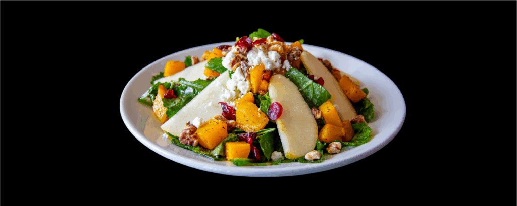 Baby Kale, Apple Slices, Roasted Squash, Walnuts, Dried Cranberries, Goat Cheese, Maple Vinaigrette