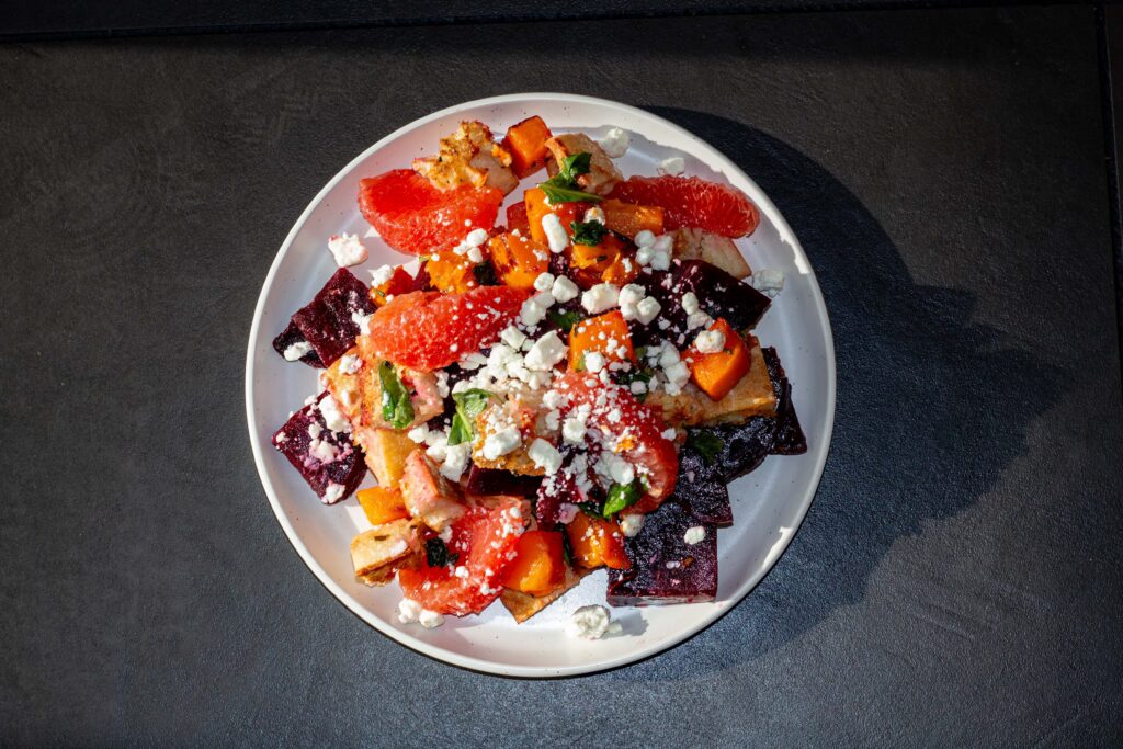 Roasted Beets, Butternut Squash, Arugula, Toasted Bread, Basil, Grapefruit, Goat Cheese, Citrus Vinaigrette