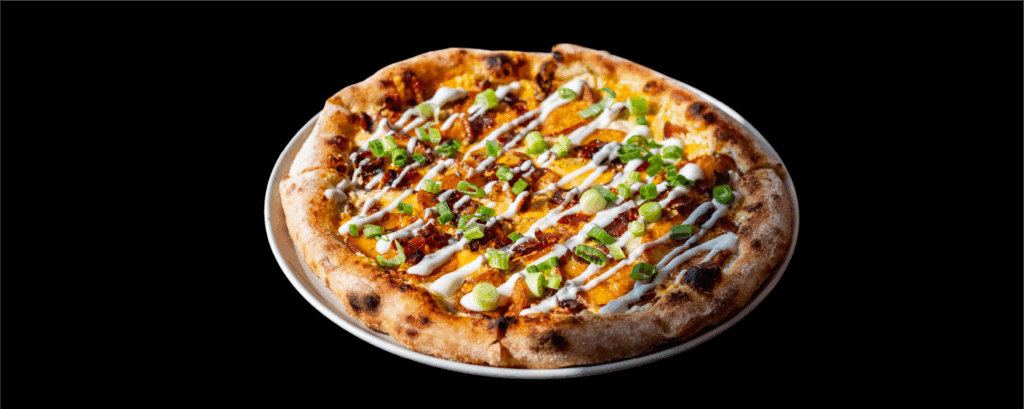 Alfredo Ricotta Cheese Sauce, Fried Potato Slices, Pancetta, Fior Di Latte, Cheddar Cheese, Green Onions, Garlic Sour Cream