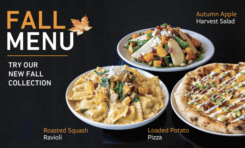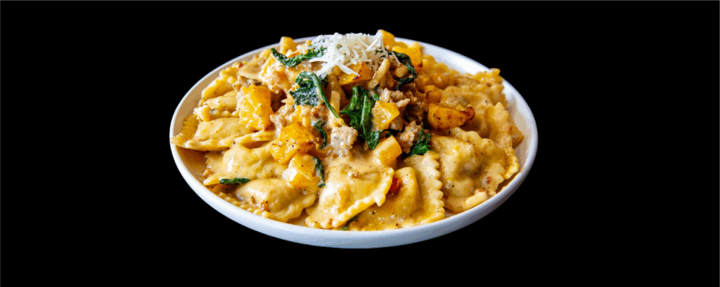 Butternut Squash Ravioli, Alfredo, Italian Sausage, Baby Kale, Roasted Squash, Almonds, La Bomba, Parmesan